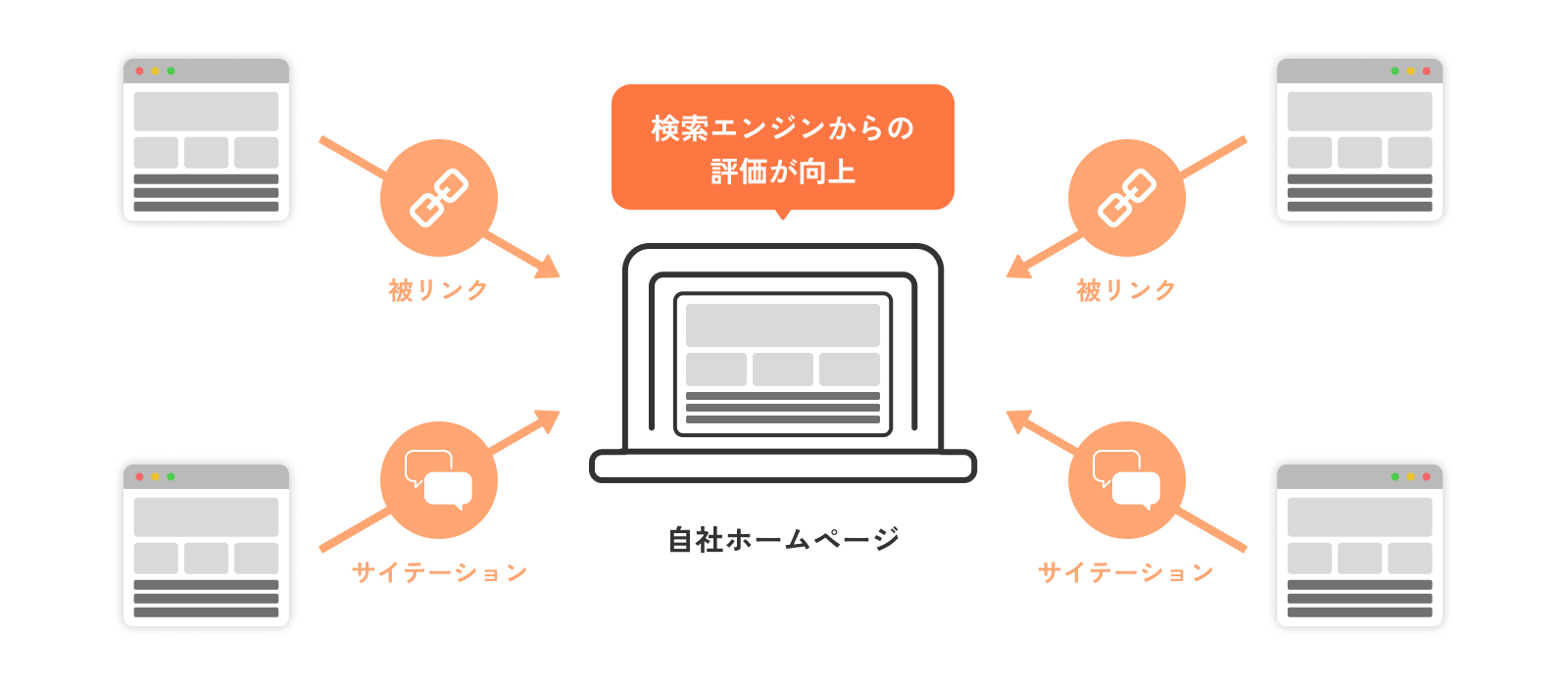 従来のGoogleは、ホームページの人気度の指標として被リンク元の数と質を主な情報源としてきましたが、現在では被リンクされていなくても、ただ言及されているだけで評価を受けると言われています。そのため、いかに他のホームページに自社コンテンツを言及してもらうか(取り上げてもらうか)が非常に重要です。