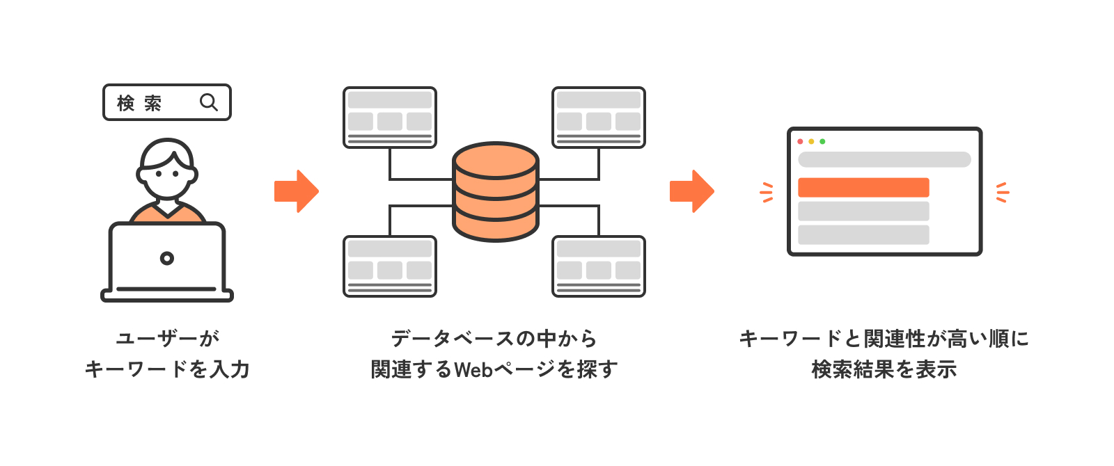 ユーザーが何らかの情報を調べるためにキーワードを入力して検索すると、インターネット上にある膨大な情報の中から、入力したキーワードと関連度が高い情報が表示されます。