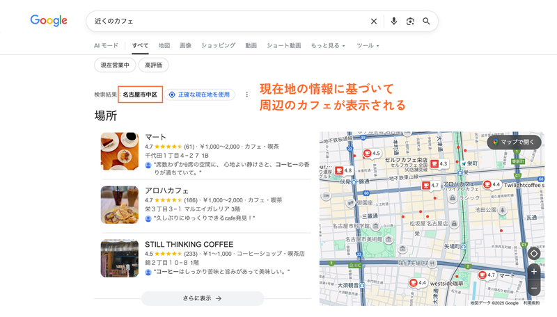 例えば、「近くのカフェ」と検索した場合、名古屋市中区に住んでいる方と北海道札幌市に住んでいる方とでは、検索結果のラインナップは異なります。これは、Googleが一人ひとりのユーザーに対して最適な検索結果を返すために位置情報を活用し、検索結果をパーソナライズしているためです。