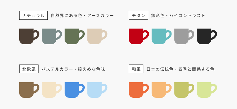 ナチュラルとモダンの色を比べてみるだけでも、雰囲気がかなり違うことがわかると思います。例えばナチュラルな雰囲気のカフェなのに、ホームページはモダンな色で設計すると、せっかくのカフェの魅力も正しく伝わりません。このように色の持つイメージは人に大きな影響を与えるため、カラー設計がホームページ制作の上で非常に重要であることがわかります。