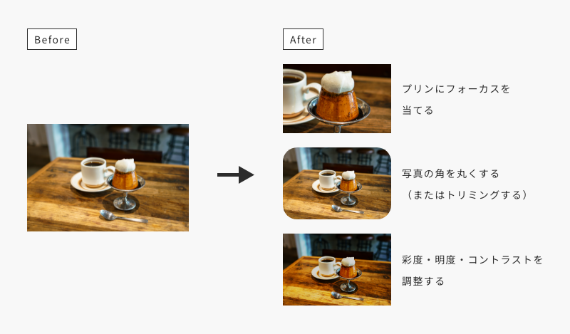 カフェのホームページ制作において、写真は一番大切なポイントだと言っても過言ではありません。写真を配置するだけで、足を運ばなくても店内や店外の雰囲気・料理・バリスタの動きなどが伝えられ、見る人に「足を運んでみたい」と思わせられます。また、単に様々なシーンの写真を載せるだけでなく、写真の余白やトーン調整で雰囲気が大きく変わるため、写真の見せ方(サイズ感やトリミング)もイメージを伝える上で大切です。例えば、モダンで落ち着いた雰囲気のカフェであれば、明度や彩度を落としてやや暗めに仕上げることで、より世界観に合った演出が可能になります。写真の見せ方一つで雰囲気もグッと高まるので、カフェのタイプに合った見せ方でより魅力的なカフェのホームページに仕上げましょう。