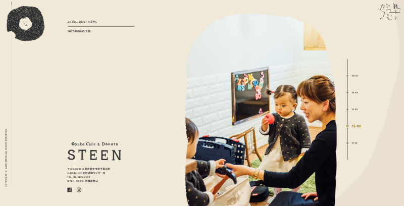 ホームページは店内や外観からも感じられる「ナチュラルさ・柔らかさ」を感じられるベージュでまとめられています。また手書き風のイラストやトリミングされた写真も特徴的です。その他にもドーナツのイラストからメニューが出てくるアニメーションやグーグルマップがベージュになっている点など、ホームページのトンマナに合うような様々な工夫がされています。ナチュラルなカフェのホームページをデザインするのであれば、STEENのように色合いや写真のトリミングを工夫してみるとナチュラルさや柔らかさが演出できます。