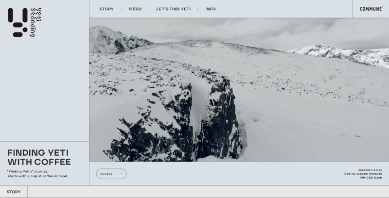グラフィック、ホームページなどのデザインや企業・ショップのブランディングなどを手掛ける株式会社COMMUNEが運営しています。ホームページもとてもデザイン性が高く、ファーストビューでは一見コーヒースタンドとは分からないオシャレでスタイリッシュなデザインとなっています。店内のシンプルでモダンな雰囲気を壊さないようなモノクロの配色に彩度の高い青のアクセントカラーや、要素ごとに罫線で区切られている点も特徴的です。また写真のコントラストが高くはっきりとした色味であること、デザインの4原則がしっかり用いられており見やすくて分かりやすくなっている点も、YETI STUNDINGのようなモダンな雰囲気を演出できる要素の一つだと言えるでしょう。
