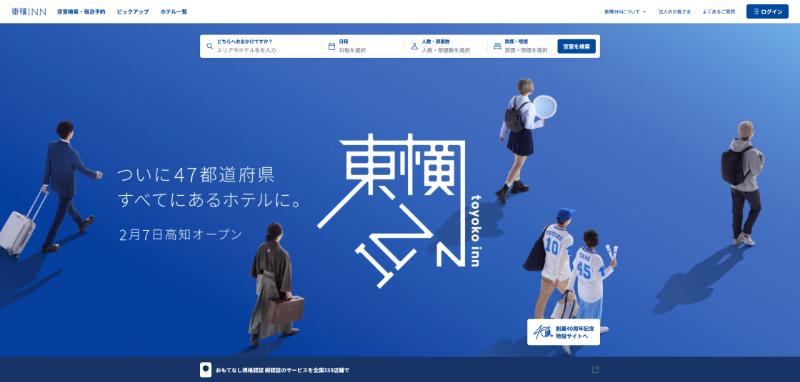 メインカラーに青を使用することで信頼感を与えるデザインになっており、メインビジュアルにはさまざまな目的で利用する宿泊者の写真を配置することで、幅広いターゲットに対応していることが直感的に伝わる構成になっています。