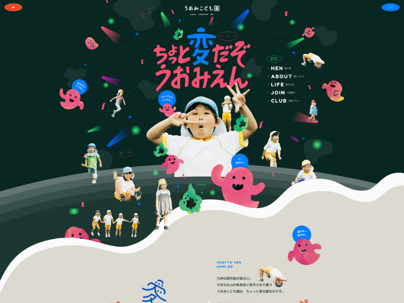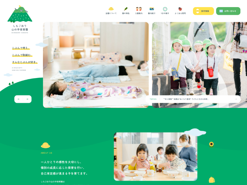 黒を基調とした背景に、ビビッドな配色や印象的な写真の使い方が特徴的なサイトです。配色やビジュアル表現を通して、園のコンセプトがデザインにしっかりと落とし込まれており、園の雰囲気が自然に伝わる構成になっています。イラストはやわらかさを感じる水彩テイストで統一されており、鮮やかな配色でありながらも親しみやすさを感じられる点も印象的です。イラストカードをめくることで園の特徴が分かるコンテンツなど、遊び心のある仕掛けも取り入れられています。TOPページは印象的な演出で関心を引きつけつつ、下層ページでは目的ごとに情報が整理されており、閲覧しやすい構成になっています。コンセプトをデザインに落とし込む好例といえるでしょう。